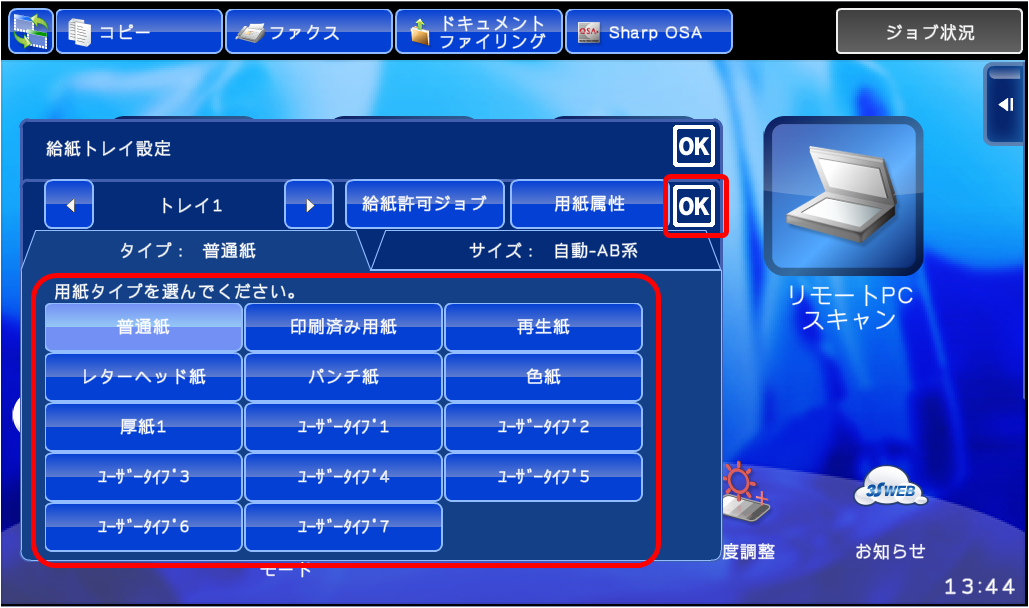 A4やB4などのAB系用紙をセットする場合は[自動-AB系]を選択します