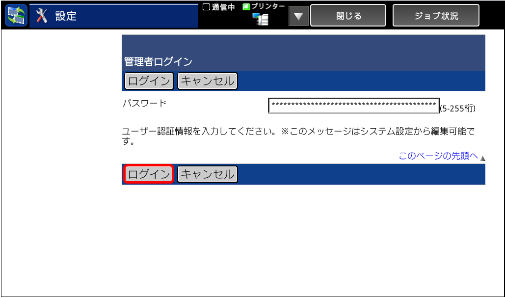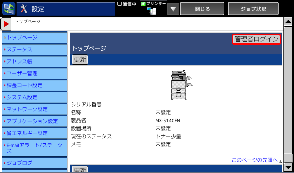 法人のお客様 TOP オフィスソリューション(複合機・コピー機・プリンター関連商品) お客様サポート よくあるご質問 管理者としてログインしたい。 よくあるご質問 前の画面に戻る 質問 管理者としてログインしたい。(FAQ No.00416) 対象環境 MX-4140FN / MX-4141FN / MX-5140FN / MX-5141FN 回答 管理者ログインは以下の手順で行います。 操作ステップ ①ホーム画面の[設定]を押してください。 ②[管理者ログイン]を押してください。 ③パスワードの右側にあるテキストボックスを押してください。 ④管理者パスワードを入力してください。 【注意!】 管理者パスワードは、管理者に問い合わせてください。 ⑤パスワードを入力後、[ログイン]を押してください。 関連キーワード 管理者 / パスワード / ログイン / 管理者ログイン 各製品のよくあるご質問トップに戻る MX-4140FN / MX-4141FN / MX-5140FN / MX-5141FN よくあるご質問トップへ戻る 前の画面に戻る ページのトップへ戻る