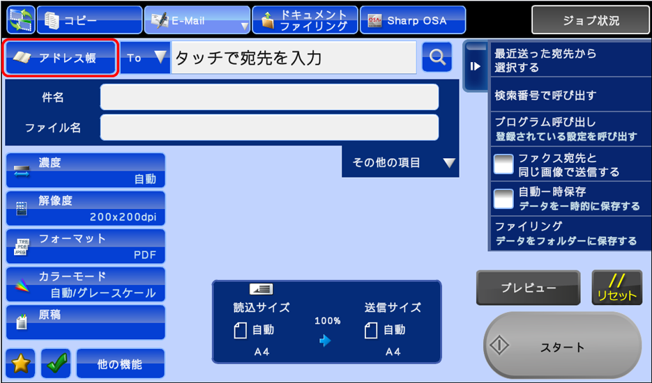 「複合機」でスキャンしたデータを、E-mail(アドレス帳)に添付してパソコンに送るには?(FAQ No.00422)
