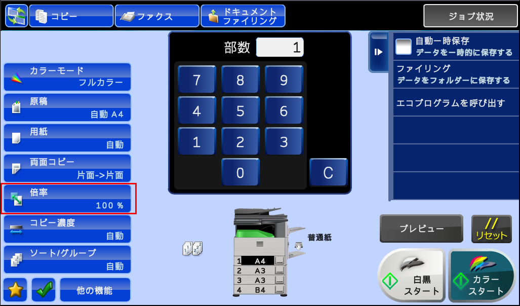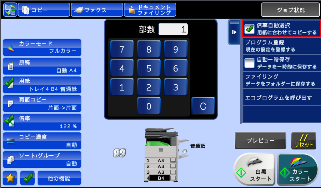 ⑥コピー操作の基本画面に戻りますので、アクションパネルの[倍率自動選択]にチェックを入れてください。