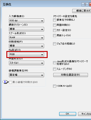 プリンタードライバーの設定により「RGB」か「CMYK」を選択してプリントデータを複合機に保存することができます。([全般]タブ→「基本設定」→[高度な設定]タブ→「互換性」→「Rip形式」)※初期値は「RGB」