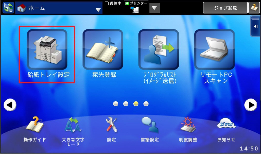②ホーム画面から「給紙トレイ設定」を選択してください。