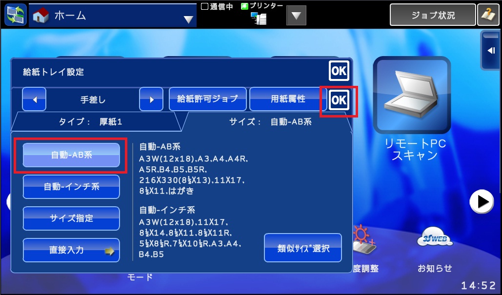 ⑥「サイズ」を選択して、[自動-AB系]を選択し、[OK]を押してください。