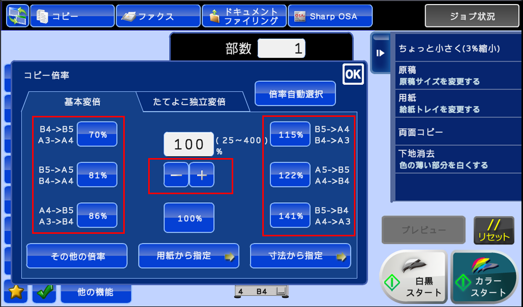 ※自動で拡大、縮小したい場合は■自動で原稿を拡大や縮小してコピーしたいのですが、どうすればよいですか?(倍率自動選択)を参照してください。