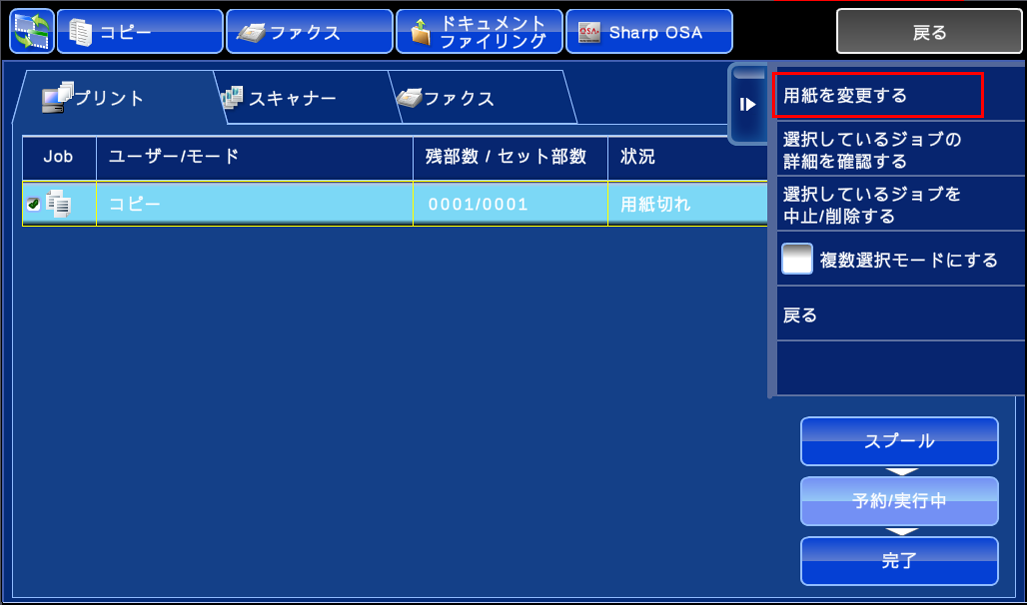 ②[予約/実行中]キーをタップし、[用紙切れ]になっているジョブを押してください。