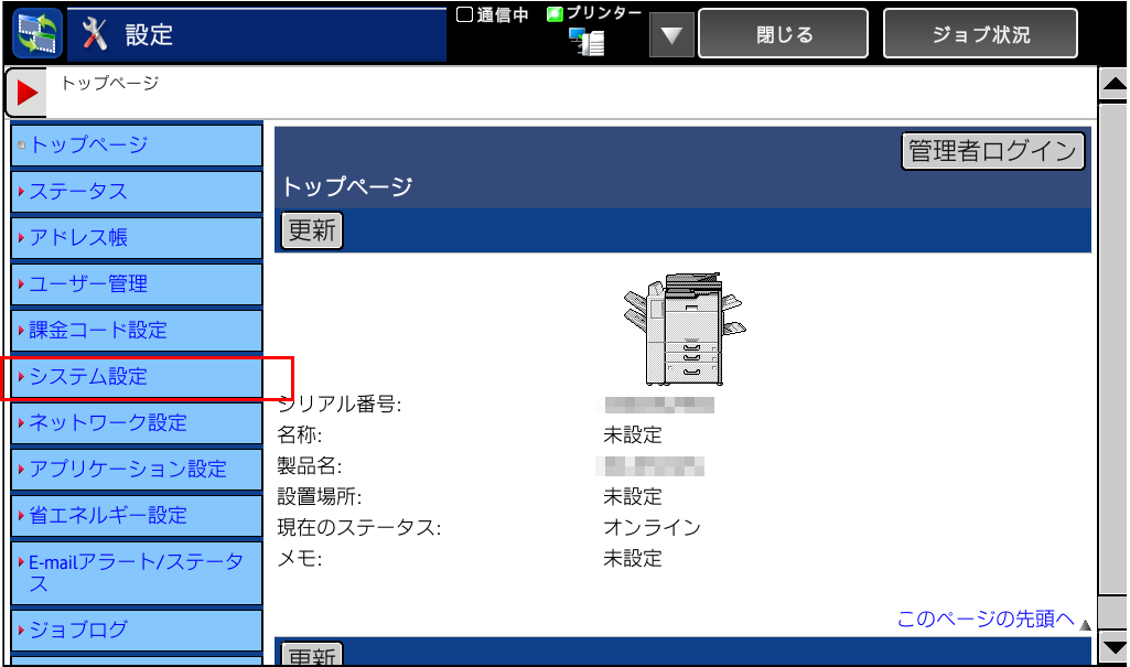 ②「設定」画面が表示されますので、[システム設定]を押してください。