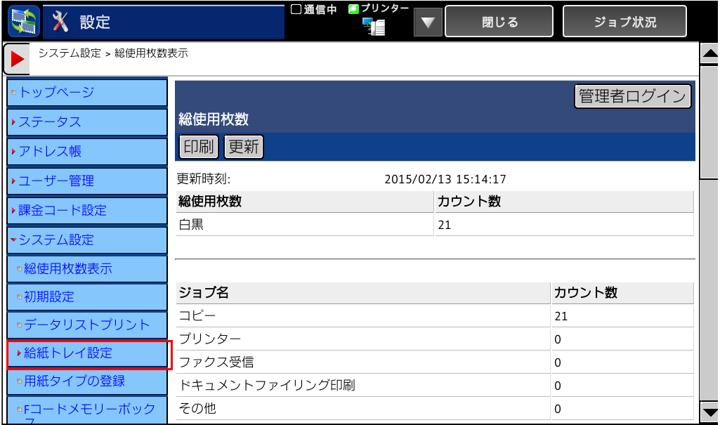 ■給紙トレイ設定画面