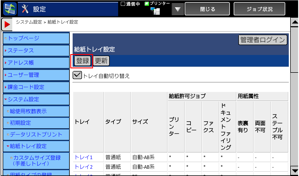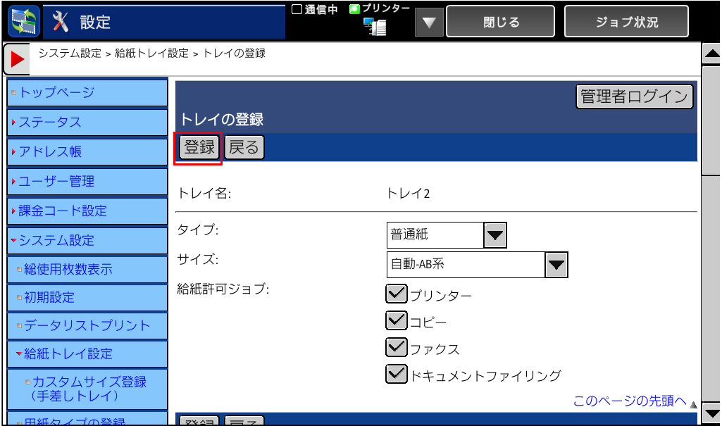 ⑥「給紙トレイ設定」画面に戻りますので、[登録]を押してください。