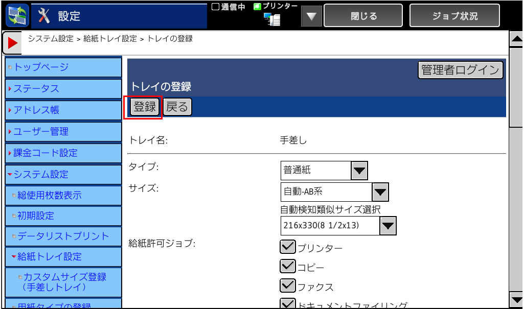 ■手差しトレイの登録画面