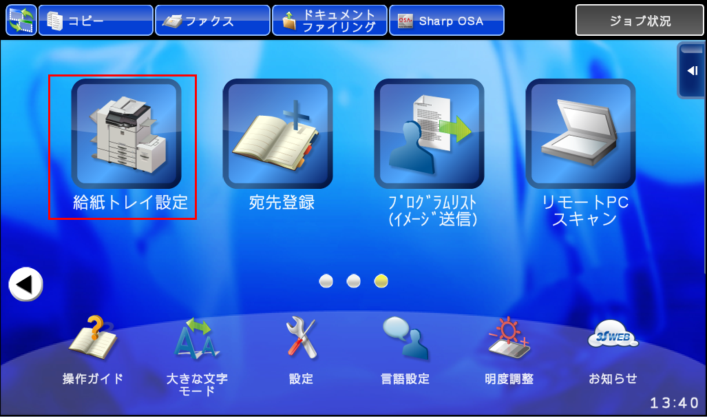②ホーム画面から「給紙トレイ設定」を選択してください。