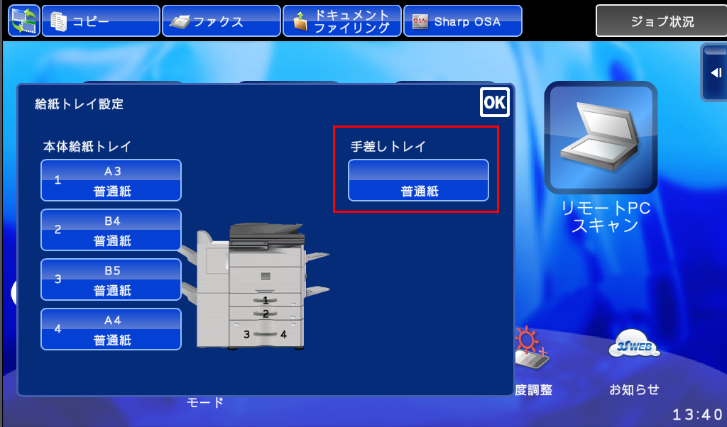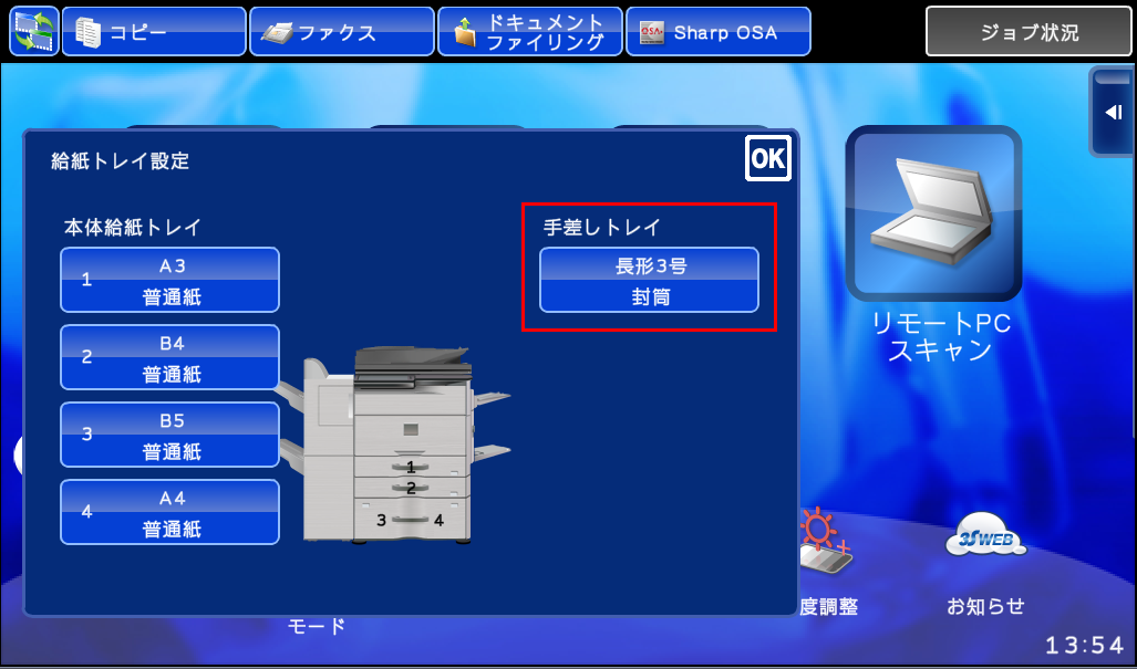 ③「手差しトレイ」が、下図のように表示されている場合は、[OK]押し、手順⑦へ進んでください。表示されていない場合は手順④へ進んでください。(例:長形3号)