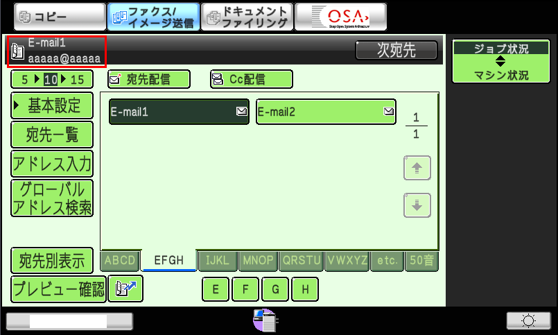※E-mailアドレスを直接入力して、宛先を指定する場合は、「複合機」でスキャンしたデータを、E-mail(直接入力)に添付してパソコンに送るには?を参照してください。