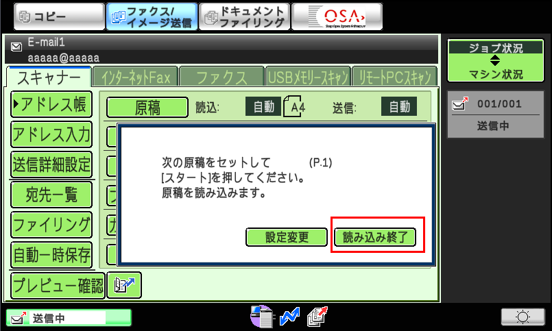 ⑧「次の原稿をセットして[スタート]を押してください。原稿を読み込みます。」が表示されますので、次の原稿がある場合は原稿を入れ替えて[スタート](本体ボタン)を押してください。次の原稿が無い場合は[読み込み終了]を押してください。