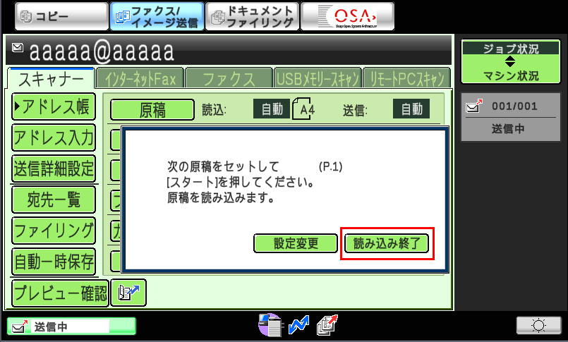 ⑩「次の原稿をセットして[スタート]を押してください。原稿を読み込みます。」が表示されますので、次の原稿がある場合は原稿を入れ替えて[スタート](本体ボタン)を押してください。次の原稿が無い場合は[読み込み終了]を押してください。