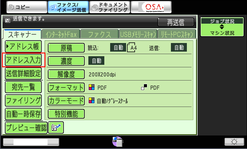 ③「ファクス/イメージ送信」画面が表示されますので、[スキャナー]タブを押してください。