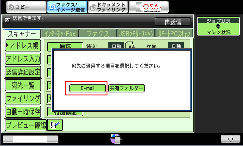 ⑤「宛先に適用する項目を選択してください。」の画面が表示されますので、[E-mail]を押してください。