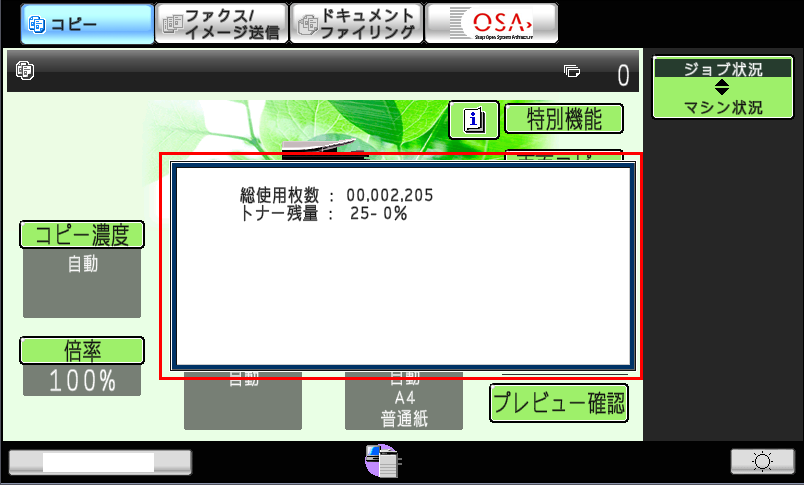 法人のお客様 TOP オフィスソリューション(複合機・コピー機・プリンター関連商品) お客様サポート よくあるご質問 総使用枚数とトナー残量を表示するには? よくあるご質問 前の画面に戻る 質問 総使用枚数とトナー残量を表示するには?(FAQ No.00496) 対象環境 MX-M264FP / MX-M314FP / MX-M354FP 回答 総使用枚数とトナー残量を表示するには、以下の操作ステップを行ってください。 ■操作ステップ ①ホーム画面で[コピー]を押してください。 ②コピー基本画面が表示されますので、[コピー]を長押ししてください。 ③総使用枚数(カウンター)とトナー残量が表示されます。 各製品のよくあるご質問トップに戻る MX-M264FP / MX-M314FP / MX-M354FP よくあるご質問トップへ戻る 前の画面に戻る ページのトップへ戻る