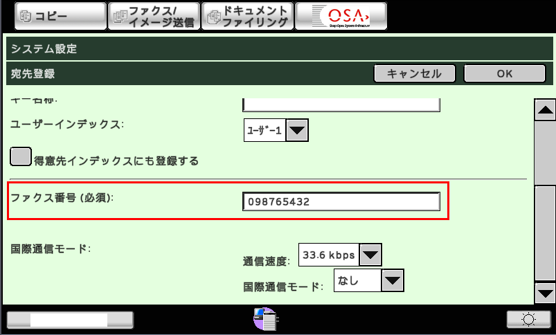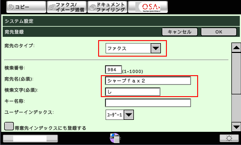 ②「宛先のタイプ」欄で「ファクス」を選び、「宛先名(必須)」「検索文字(必須)」「ファクス番号(必須)」を入力してください。