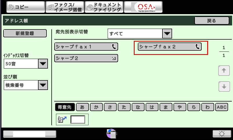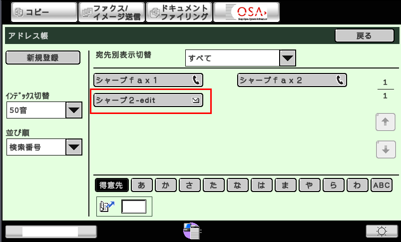 ①「アドレス帳」画面で、修正/削除したい宛先(例:シャープ2)を押してください。