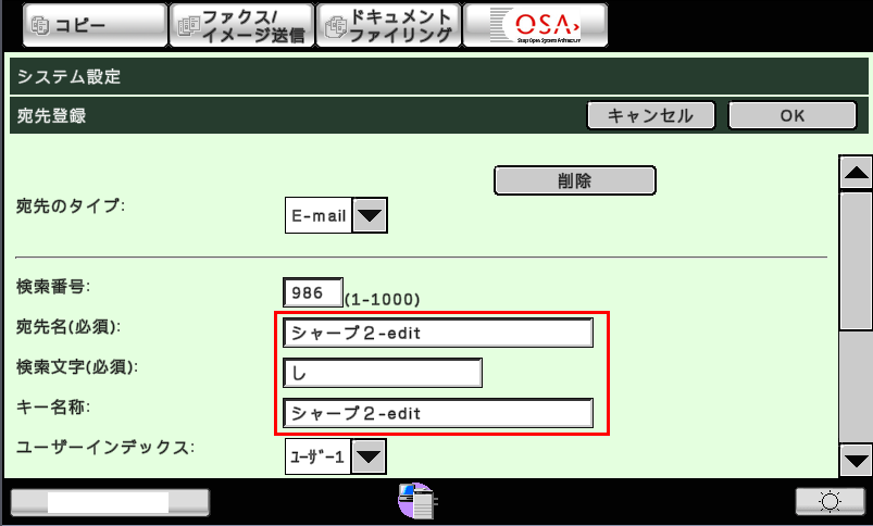 ②「宛先登録」画面が表示されますので、修正したい項目を押してキーボードを表示し、修正入力してください。