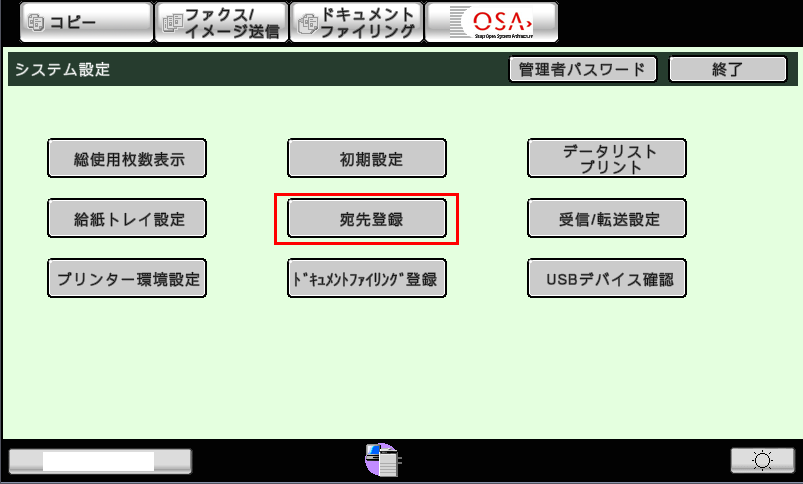 ②「システム設定」画面が表示されますので、[宛先登録]を押してください。