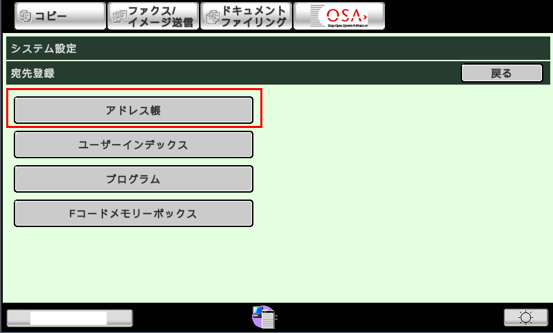 ③「宛先登録」画面が表示されますので、[アドレス帳]を押してください。