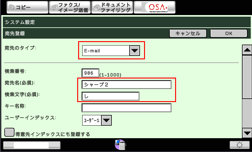 ②「宛先のタイプ」欄で「E-mail」を選び、「宛先名(必須)」「検索文字(必須)」「E-mailアドレス(必須)」を入力してください。