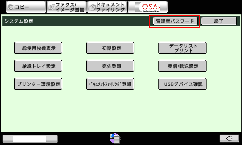 ②「システム設定」画面が表示されますので、[管理者パスワード]を押してください。