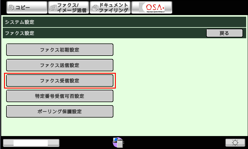 ⑥「ファクス設定」画面が表示されますので、[ファクス受信設定]を押してください。