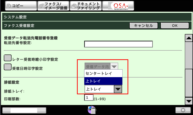 ファクスデータの出力の排紙トレイ設定は、システム設定の「ファクス受信設定」画面で変更することができます。
