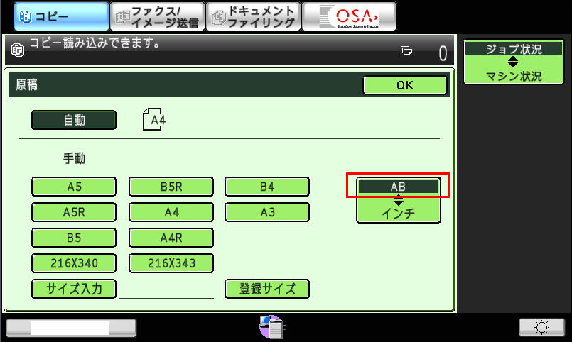 [AB]を押し、指定したい原稿サイズを設定後、[OK]を押してください。