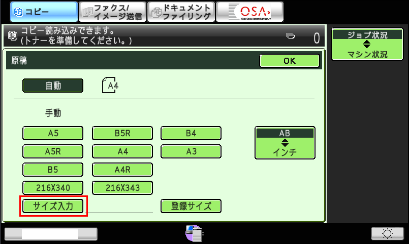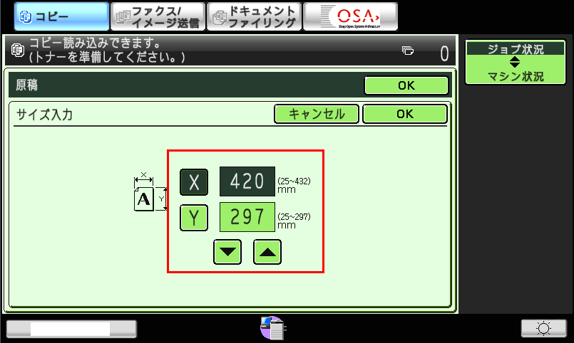 ②「サイズ入力」の画面が表示されますので、原稿サイズを設定後、[OK]を押してください。