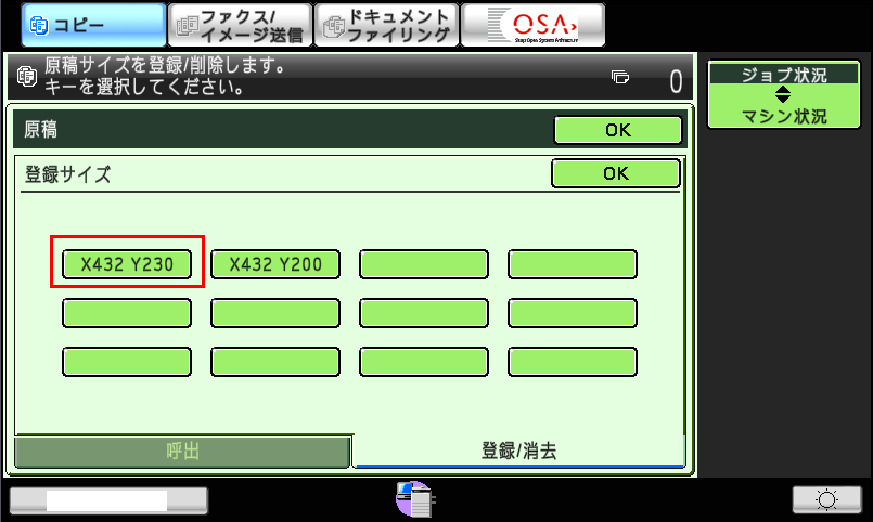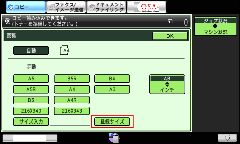 ②「登録サイズ」画面が表示されますので、原稿サイズを選択後、[OK]を押してください。