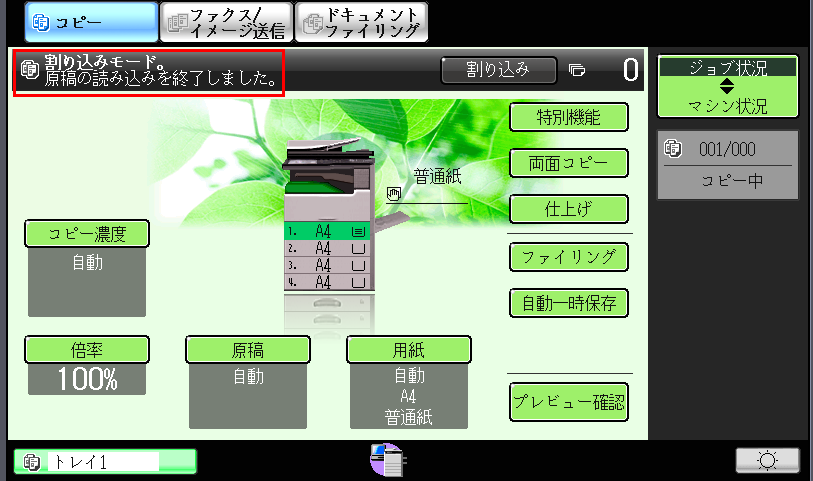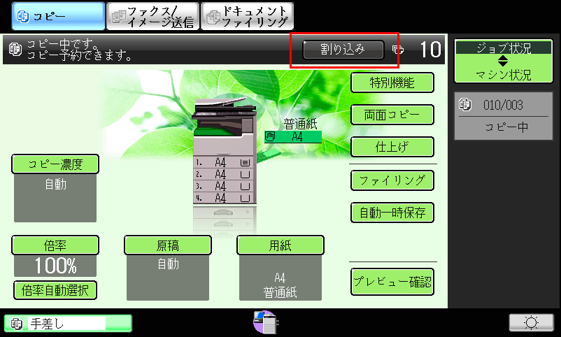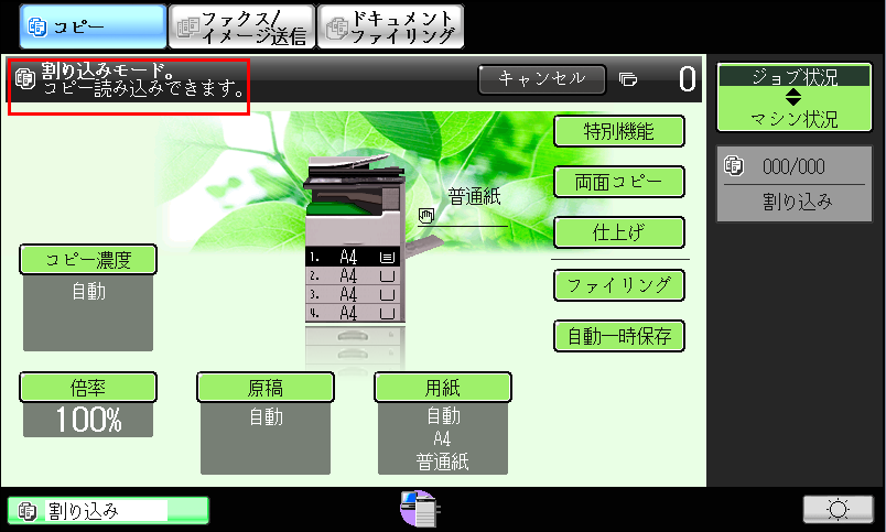コピー基本画面の[割り込み]を押すと、簡単に割り込みコピーができます。