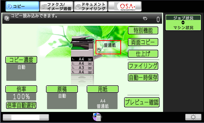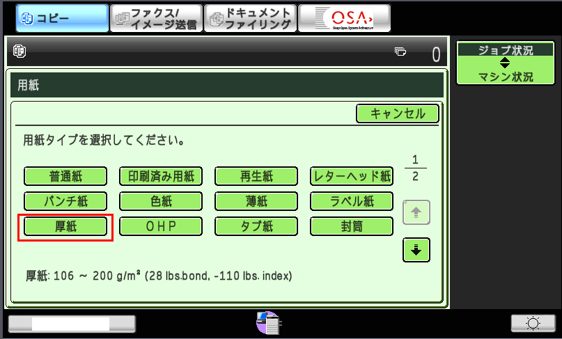 ⑦「複合機」のコピー基本画面で「用紙タイプ」の部分が「例:厚紙」になっていることを確認してください。