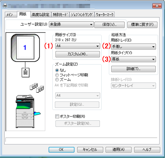 ⑧次にプリンタードライバーの設定画面で、 [用紙]タブを選択し、下記の機能を設定してください。