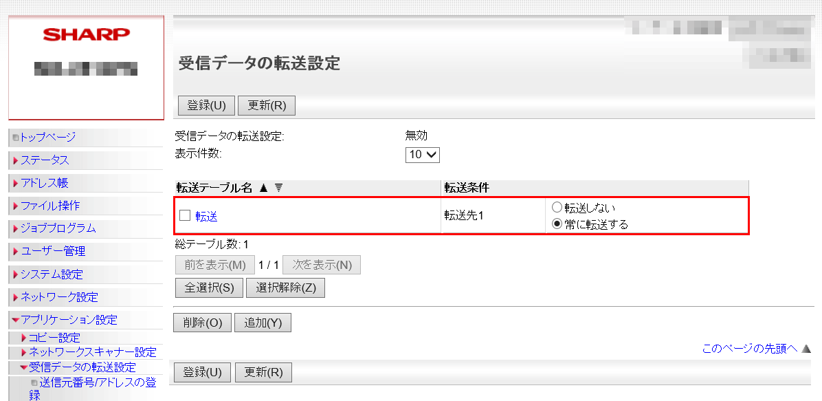 受信データの転送設定画面で、受信データの転送設定が「有効」になっており、作成した転送テーブルが[常に転送する]が選択状態になっていることを確認してください。