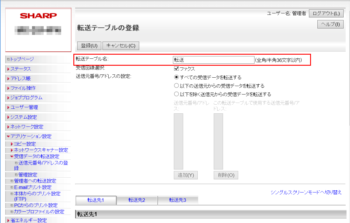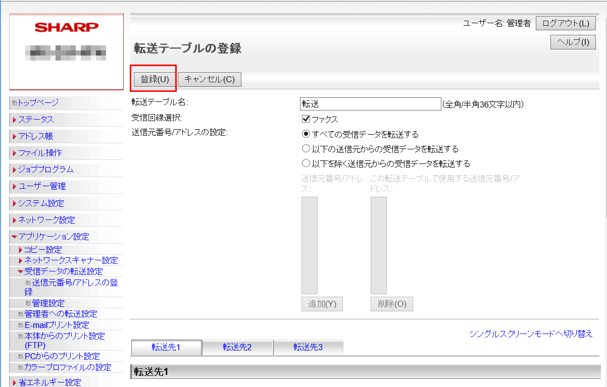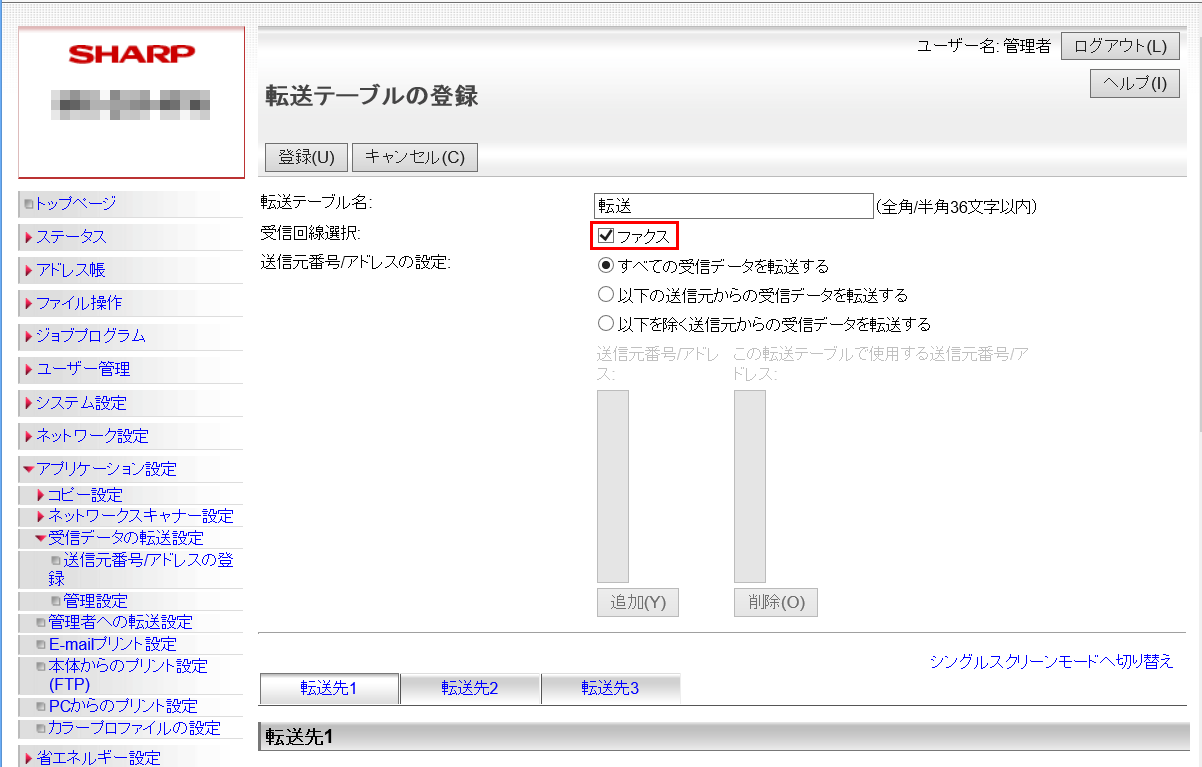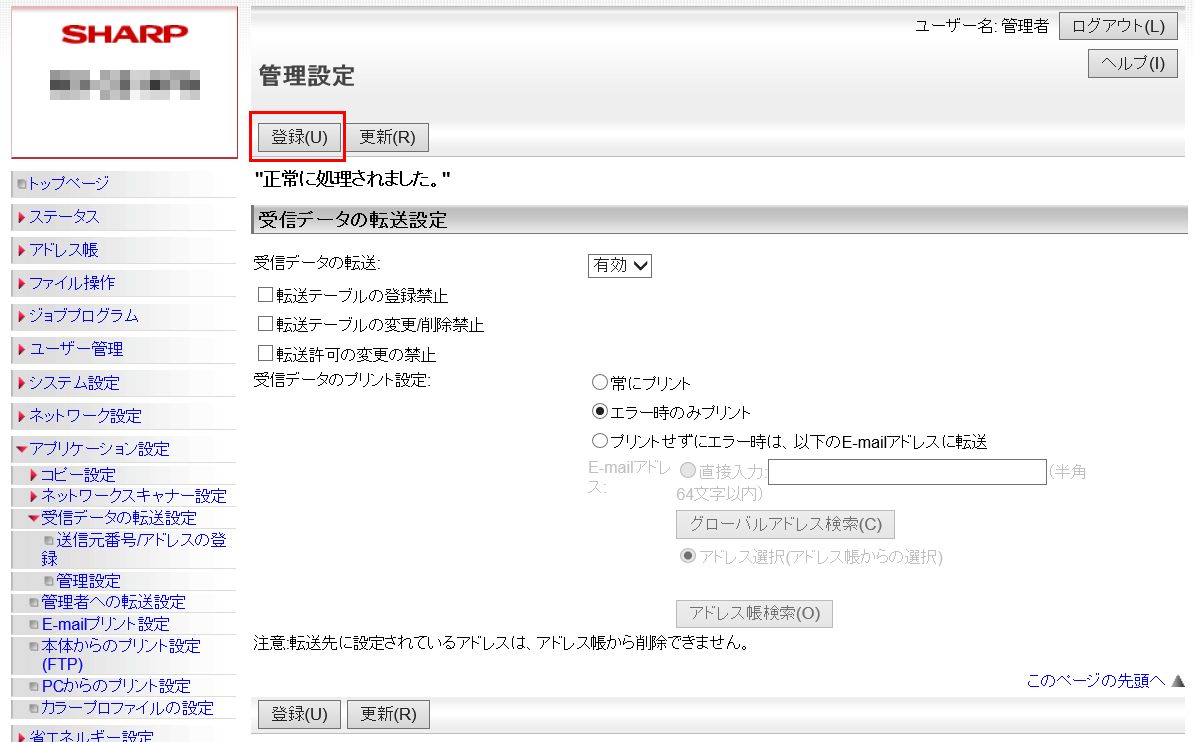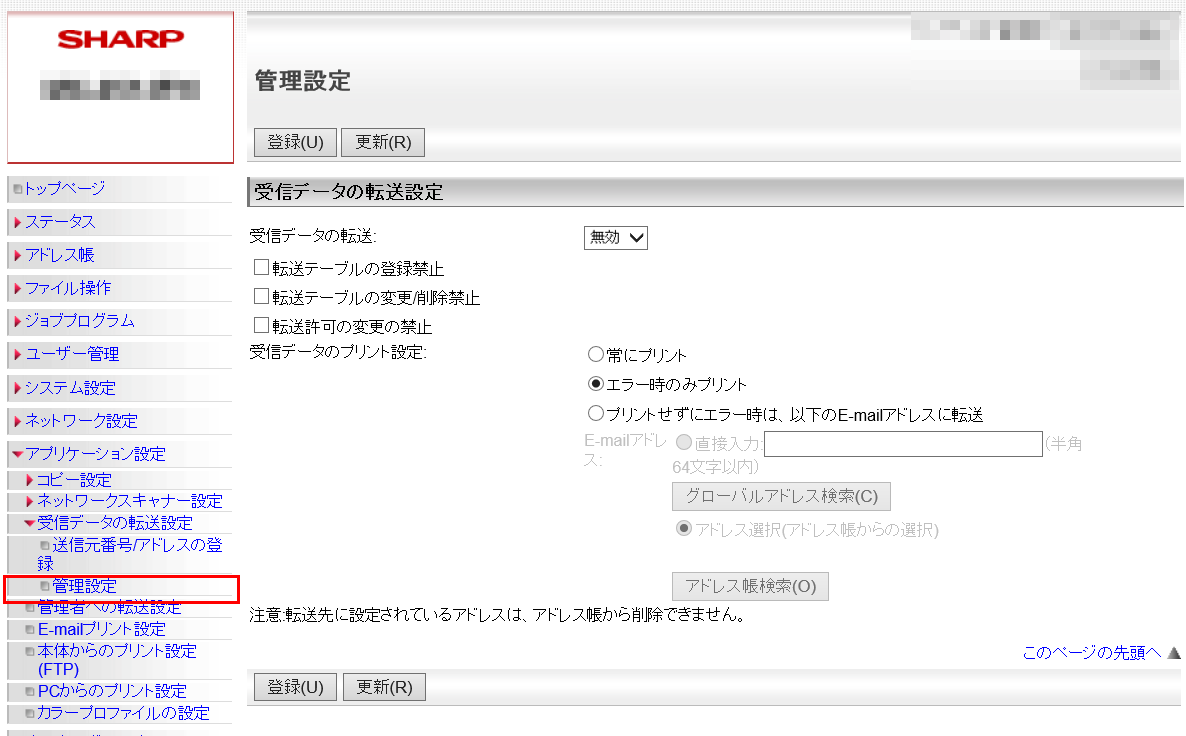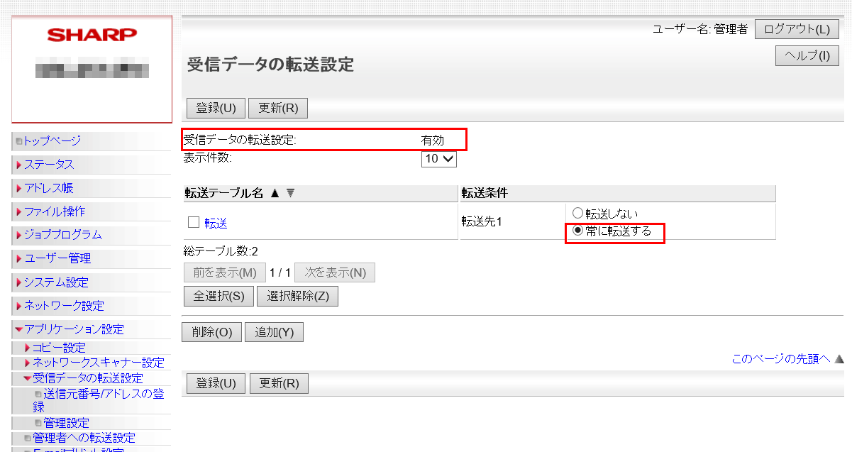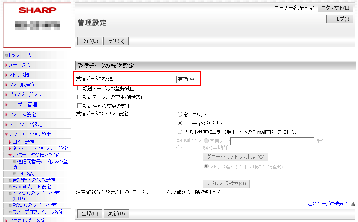 ②「管理設定」画面が表示されますので、「受信データの転送」欄を「有効」に設定してください。