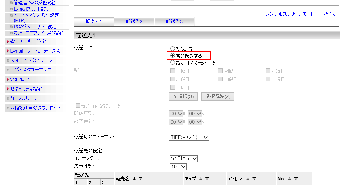 ④ページをスクロールし、「転送先1」の「設定条件」欄で[常に転送する]を押して、選択状態にしてください。
