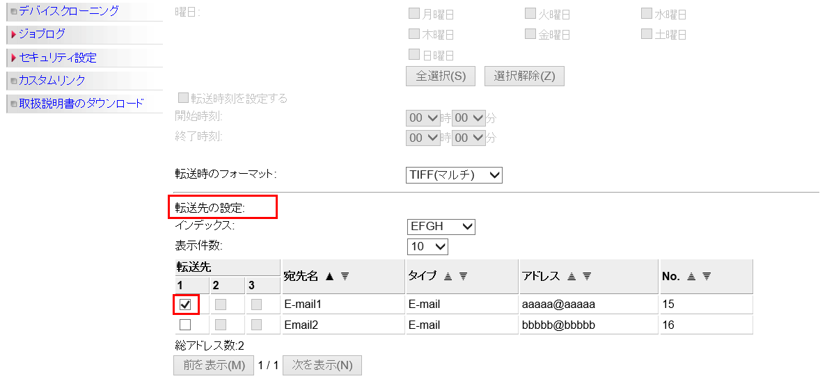 ⑤ページをさらにスクロールし、「転送先の設定」欄のアドレス帳で転送先を選び、チェックマークをつけてください。