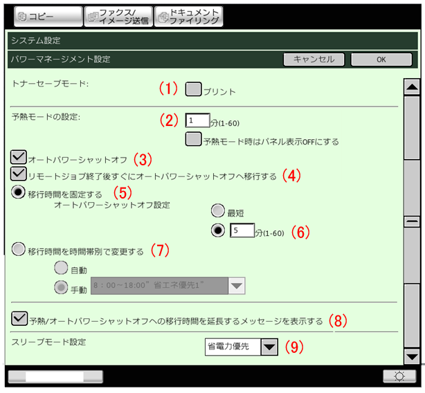 予熱モードがはたらくまでの時間を1分単位で1~60分の範囲で設定します。ジョブ終了後、放置された状態で設定した時間が経過すると予熱モードに入ります。