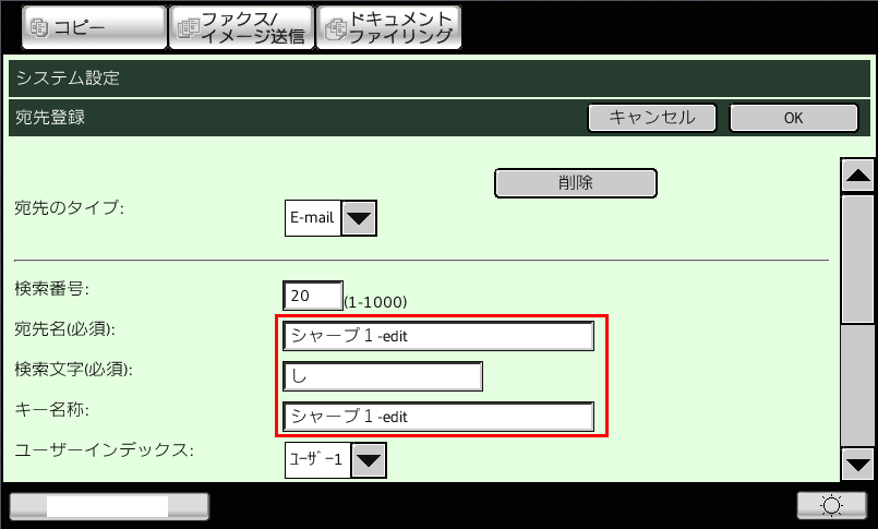 ②「宛先登録」画面が表示されますので、修正したい項目を押してキーボードを表示し、修正入力してください。