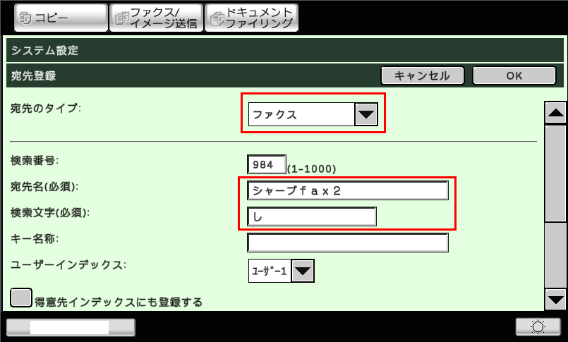 ②「宛先のタイプ」欄で「ファクス」を選び、「宛先名(必須)」「検索文字(必須)」「ファクス番号(必須)」を入力してください。
