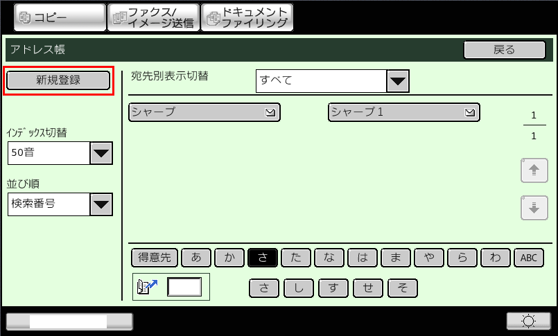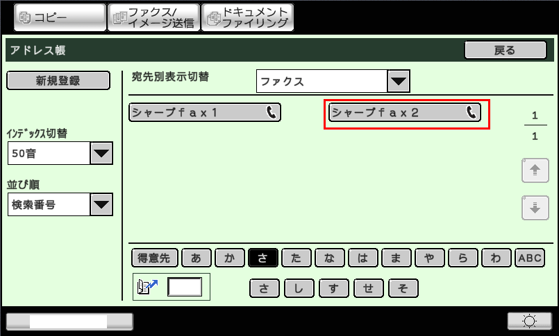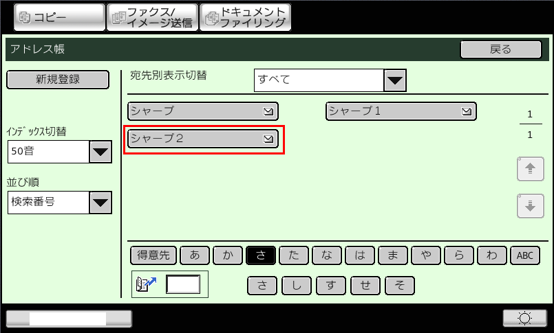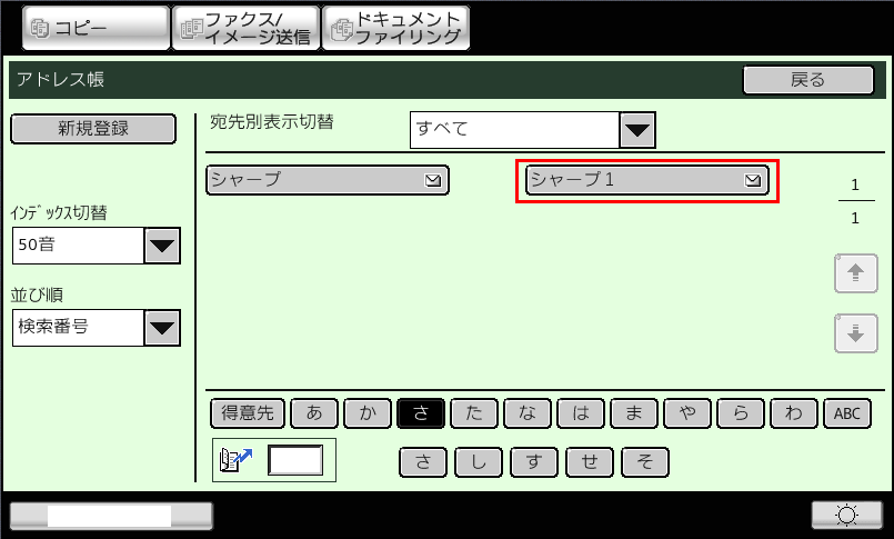 ①「アドレス帳」画面で、修正/削除したい宛先(例:シャープ1)を押してください。