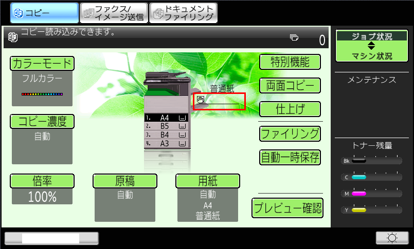 ②「複合機」のコピー基本画面で「手差し」アイコンを押してください。
