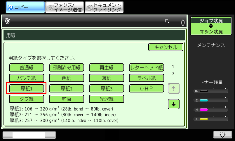 ⑤「用紙タイプの選択」画面が表示されますので、[厚紙1]を押してください。