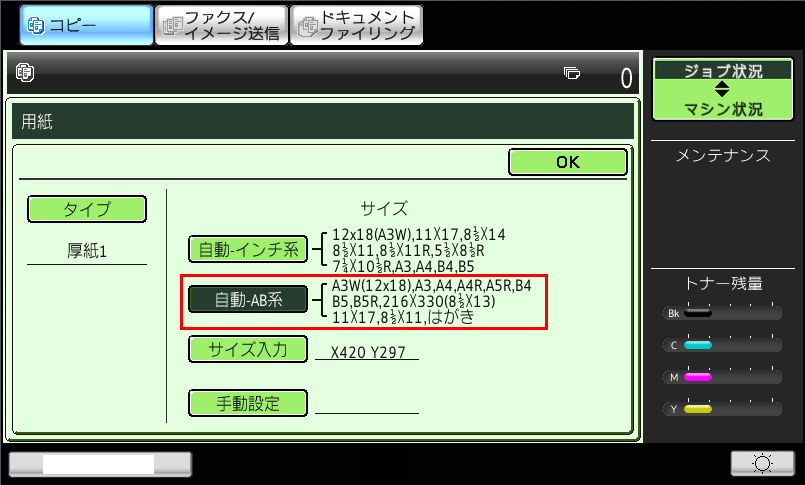 ⑥「用紙のサイズ」の画面が表示されますので、[自動-AB系]を選択し、[OK]を押してください。