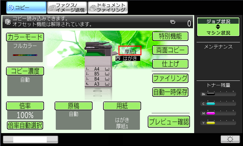 ⑦「複合機」のコピー基本画面で「用紙タイプ」が「厚紙1」になっていることを確認してください。