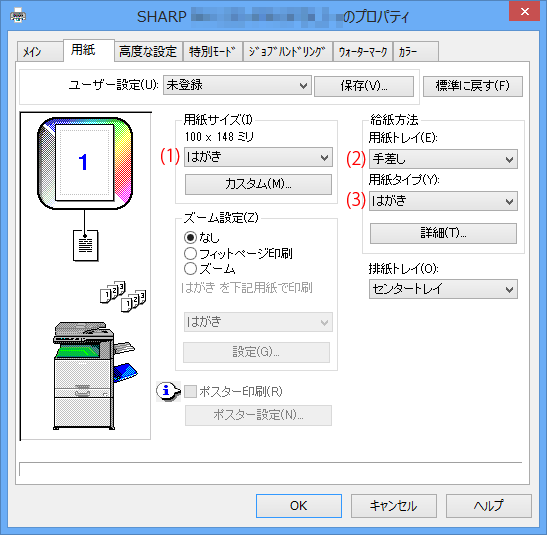 (3)「用紙タイプ(Y):」:「はがき」