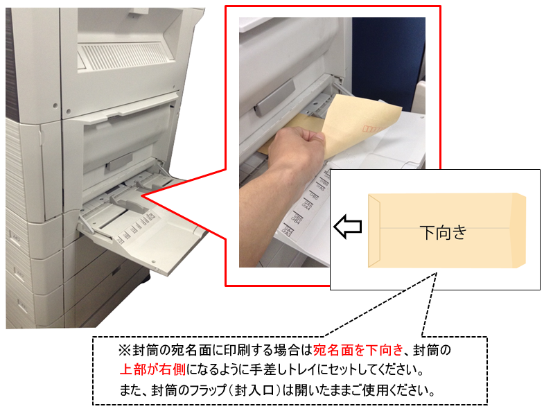 印刷する面を下向きにして、封筒の下端を複合機側に向けてセットします。